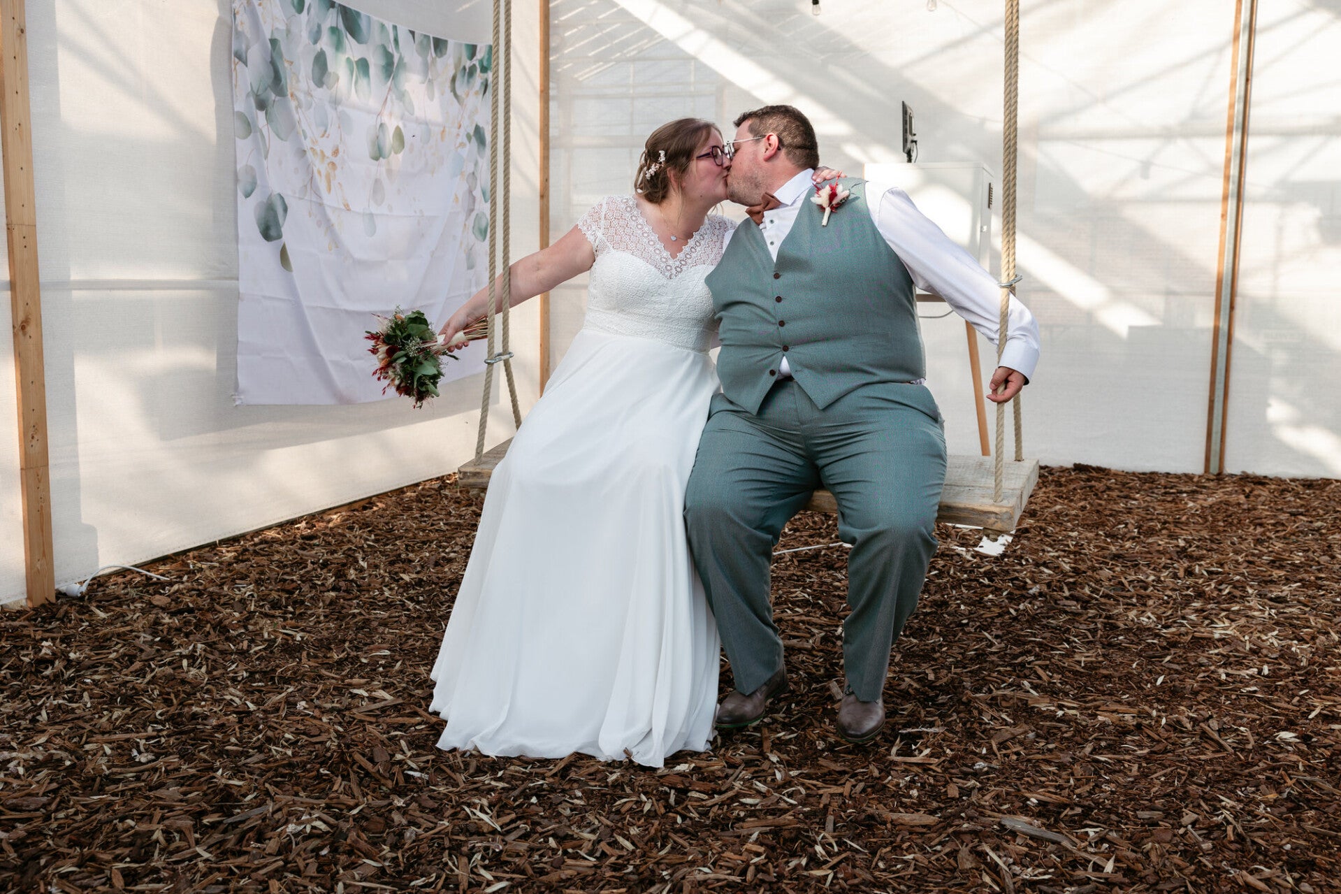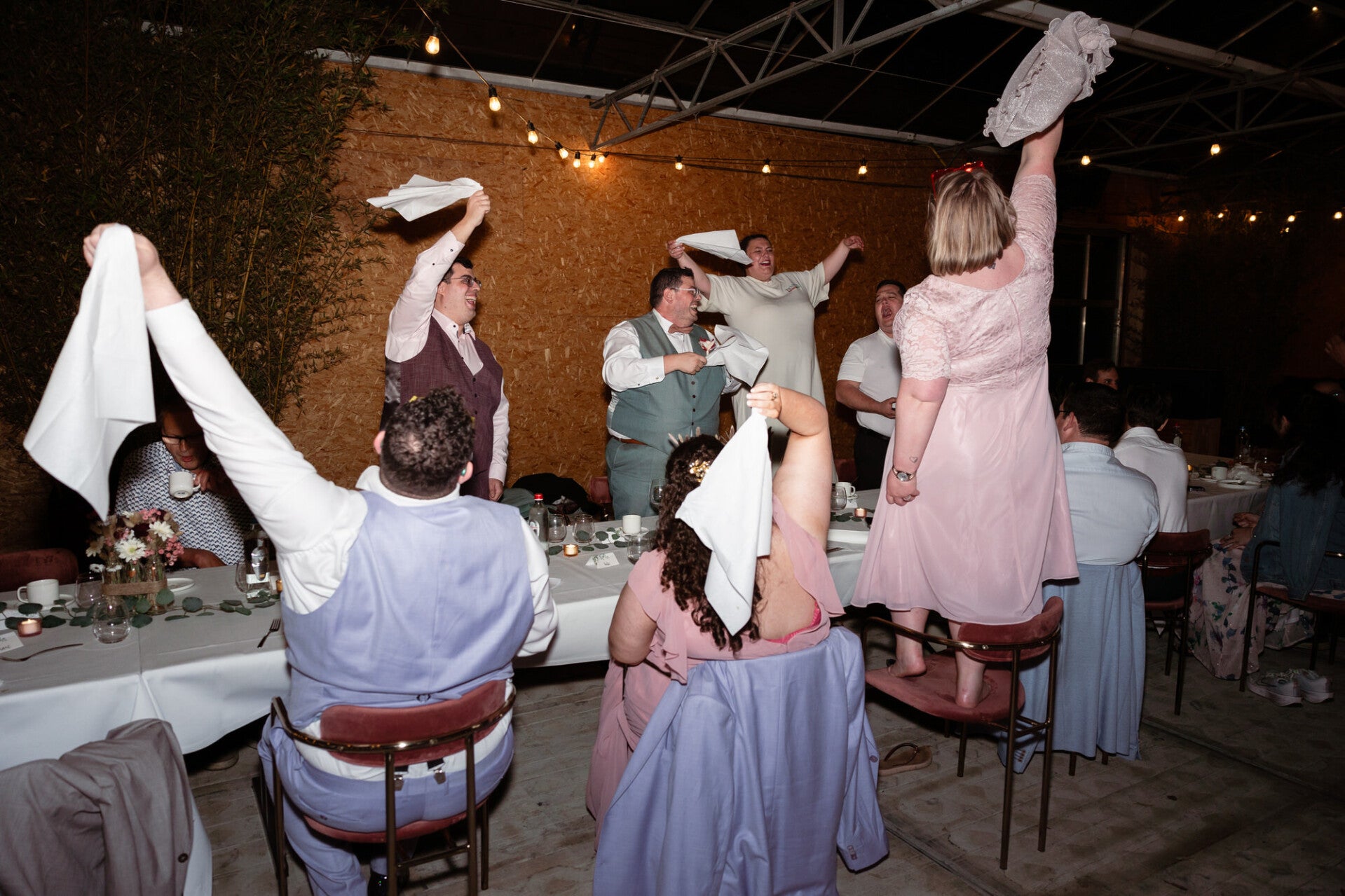 Na de ceremonie ging het feest verder in de tuin van de B&B, waar we familiefoto’s maakten vlak voor de receptie. Omdat iedereen wil stralen op zo’n dag, zag ik de familie en vrienden transformeren — van zenuwachtig in voorbereiding, tot stralend, gelukkig en klaar voor de avond. De sfeer zat er meteen goed in. Daarna ging het feest echt los in de serres van De Zomerstek, een familiebijeenkomst vol lachen, knuffels en mooie verhalen. Geuren van heerlijk eten en sfeer die tot in je botten binnenkomen — een locatie die perfect past bij het spontane en liefdevolle gevoel dat deze dag ademde.