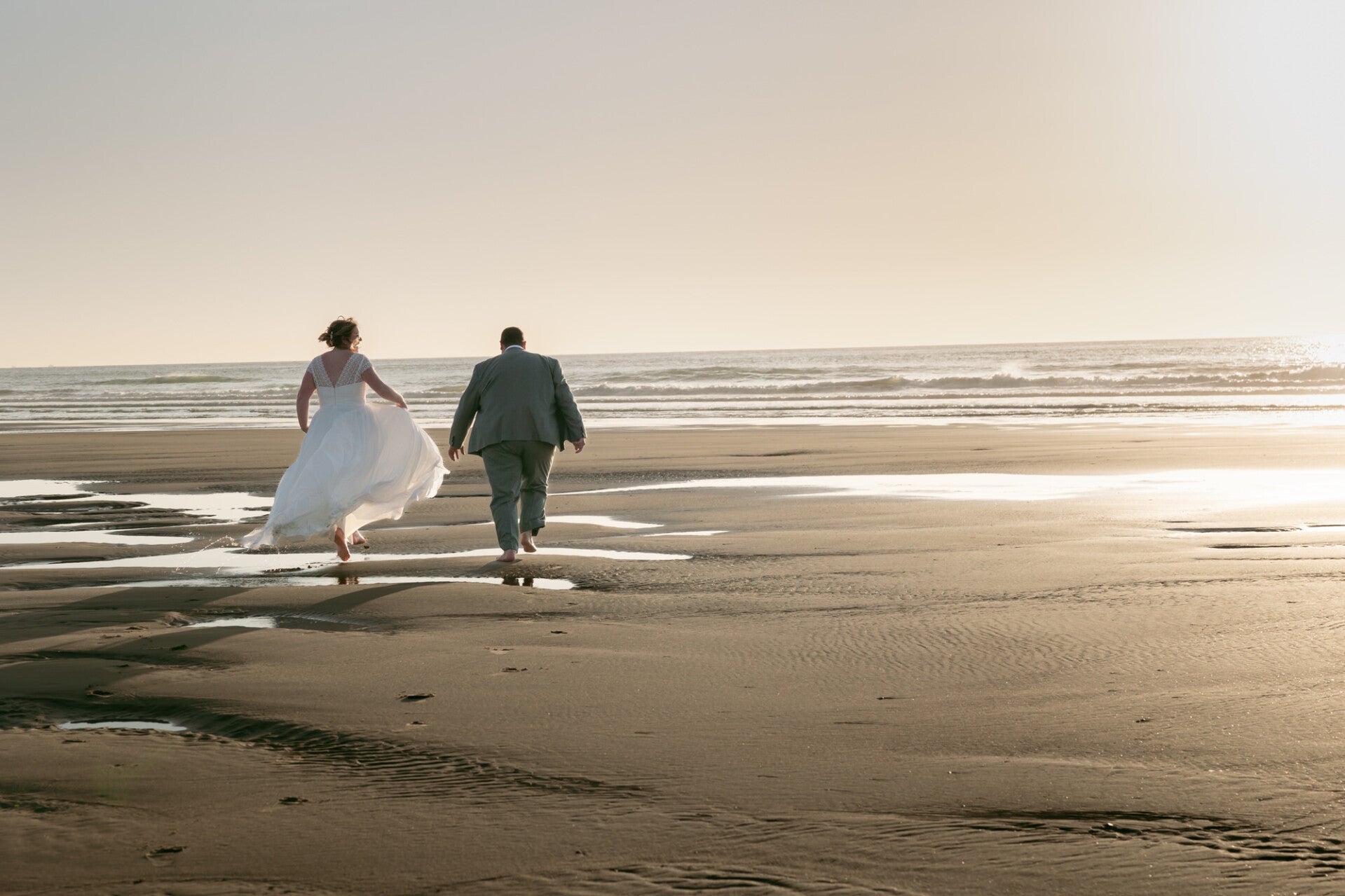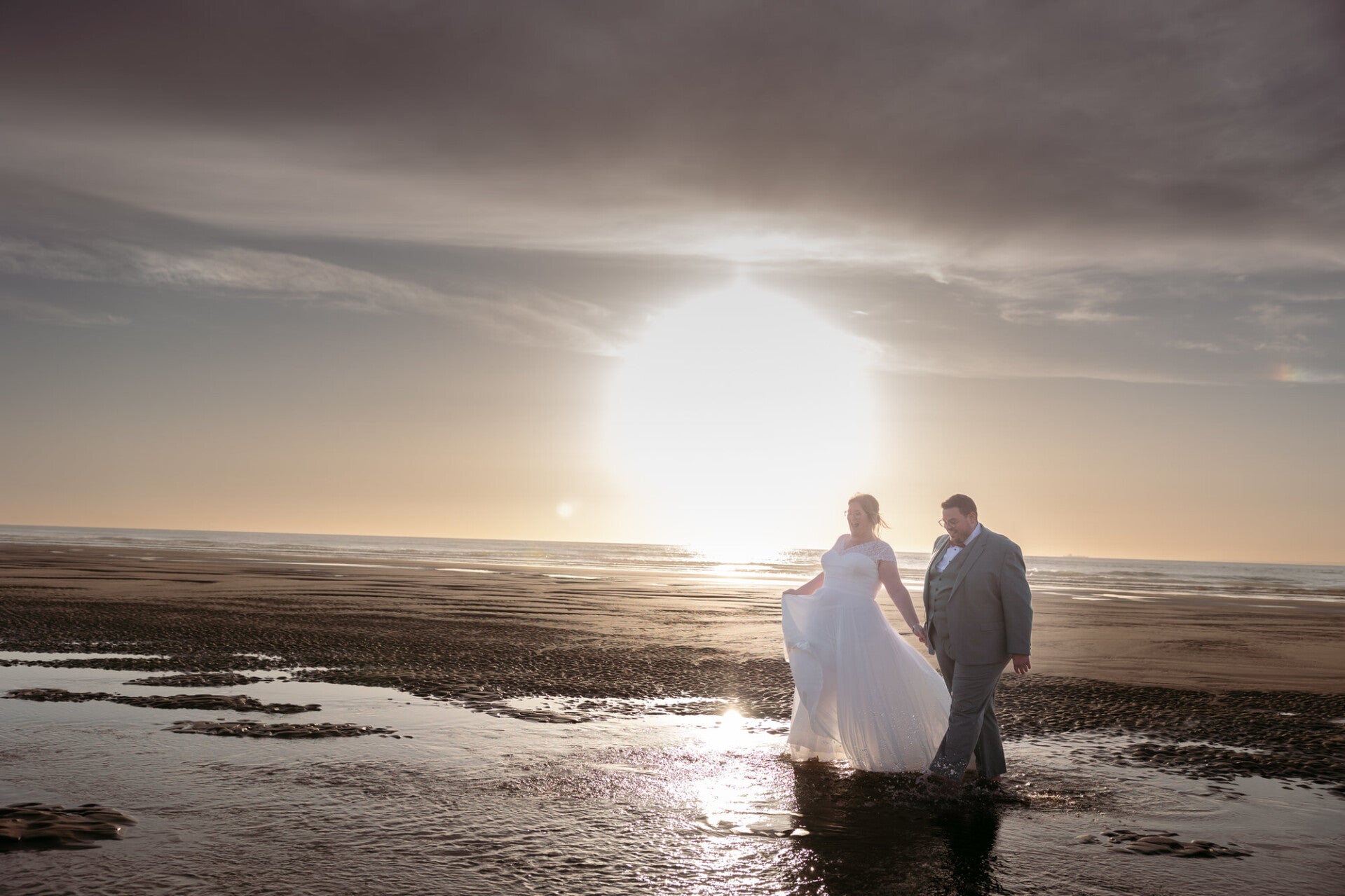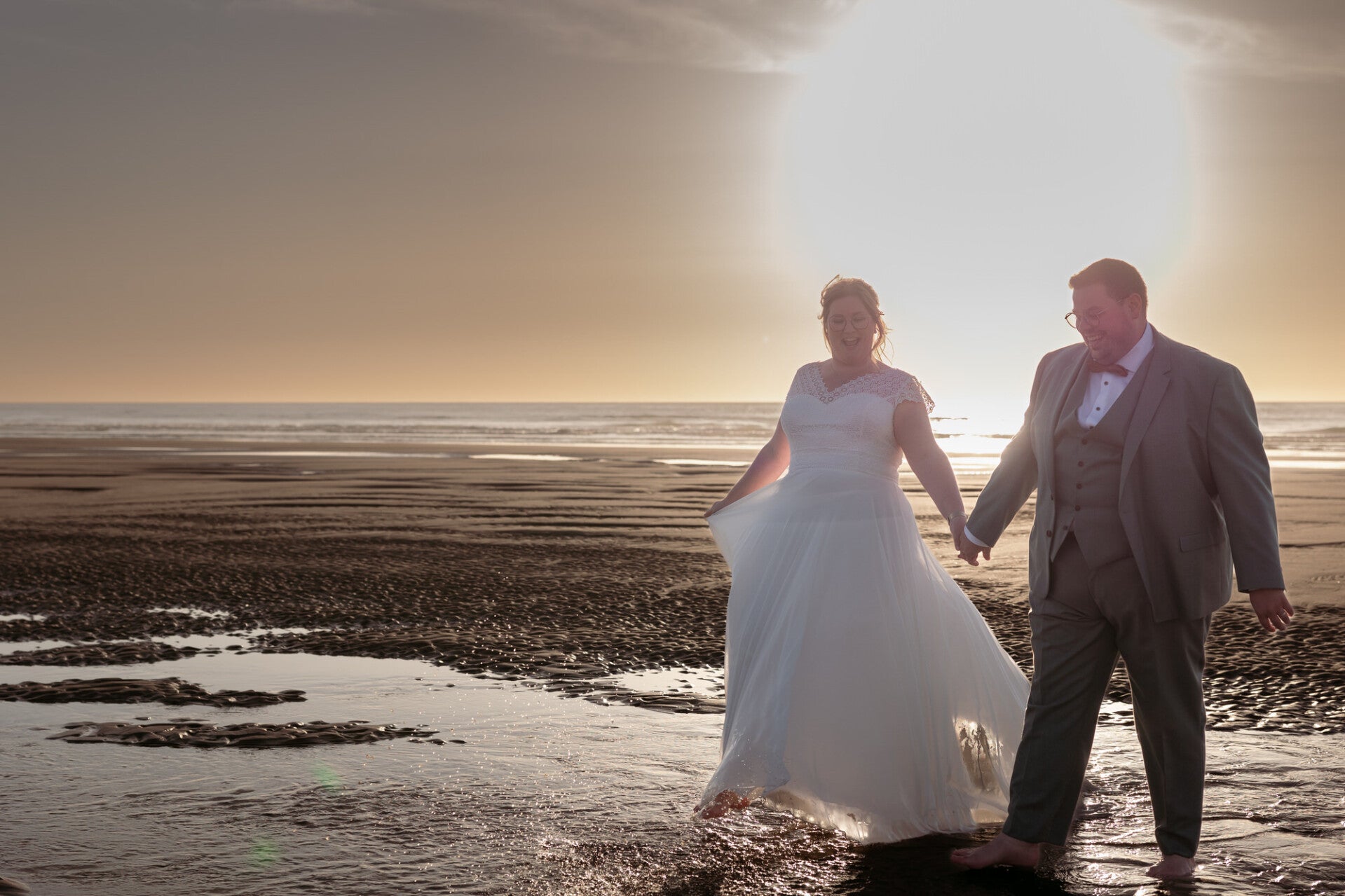 En dat was nog niet alles: op dat moment, met die zon als decor, ontstond de perfecte setting voor hun fotoshoot. Ze liepen over het strand, ongeacht de modder, het water, de zandkorrels die alles vies maakten — want dit waren geen geforceerde plaatjes, maar liefdevolle, spontane momenten. Ze sprongen in het water met hun blote voeten, haar jurk werd nat en zijn schoenen vies, en alles was even puur als dat moment zelf. Wat een koppel! Geen angst voor imperfectie, maar juist die authenticiteit. Het is die durf om echt te zijn, dat maakt voor mij een huwelijk waardevol.